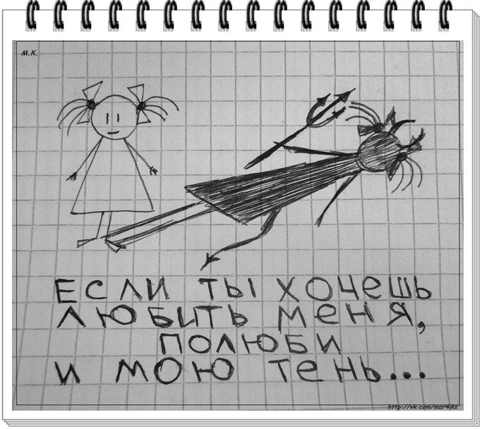 Когда ночь открывает звёзды, что рассыпаны по небосводу, Одинокие тёмные тени вырываются, наконец, на свободу. Одинокие тени людей, которым всё давным-давно надоело, Гуляют по улицам в поисках тех, кто выбелит их словно мелом. Ходят, не признанные, потерянные, всеми отверженные, Никого не найдя, скрываются утренним светом поверженные, Чтобы ночью снова выйти на поиски среди ночной темноты Тех, кто поймёт и примет, разглядит, очистит от черноты. И так до утра. А утром выходят люди, и тени пугаются их. И так каждый день, каждый раз. И каждая — часть нас самих. Впрочем, немногим везёт: однажды приходит тот день, Когда, вдруг, сам человек принимает в себе свою тень.