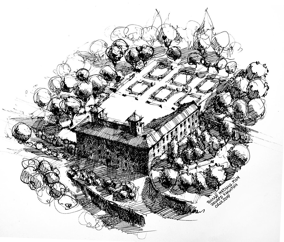 Вилла Медичи, архитектура ее зданий и окружающий ландшафт. Скетчинг линером, черно белая графика, существующая ситуация. В Риме бывал не раз, но до Виллы Медичи так пока и не добрался, понять ее архитектурно- пространственное решение с масштаба человека ещё предстоит.