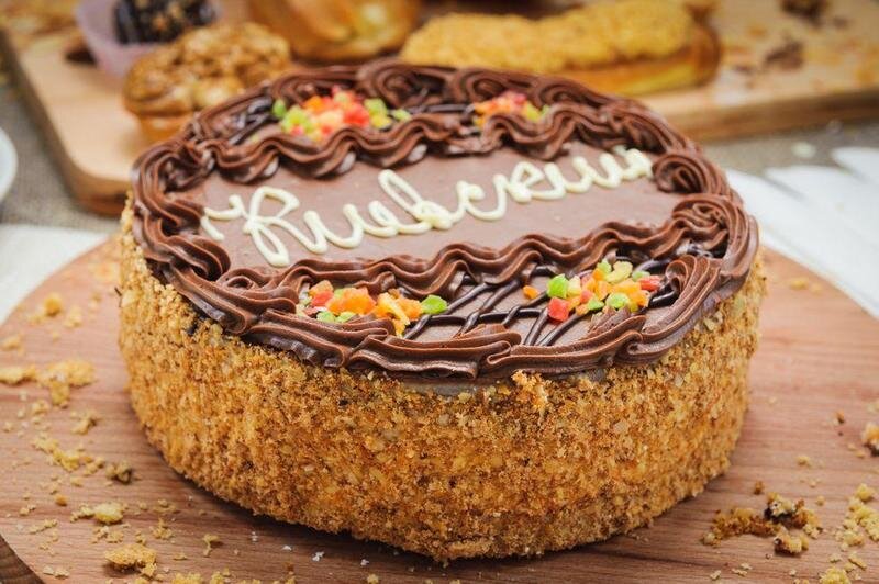 3-4 ст. лож. какао ТЕХНОЛОГИЯ ПРИГОТОВЛЕНИЯ: Белки взбить в крепкую пену, постепенно добавляя сахар, затем добавить молотые поджаренные орехи и муку. Тесто вылить на противень на бумагу для выпекания. Выпекаем при 100 градусах 2 часа, т.е. до образования корочки. Готовые коржи охладить, разрезать пополам,подрезать края, чтобы были ровные, подрезки измельчить. Крем. За час до приготовления крема развести 2 ч.л. желатина в молоке, чтобы желатин набух. Он не дает крему растекаться и делает его более вкусным. Желтки растереть с сахаром добела, добавить молоко и довести до кипения, охладить. В охлажденную массу добавить размягченное масло. Ввести в готовый крем несколько ложек какао порошка