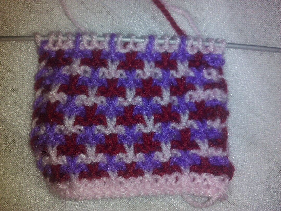 Число петель кратное 4, плюс 3 петли для симметрии узора, плюс кромочные. 1-й ряд (розовая нить) – лицевые петли 2-й ряд (розовая нить) – лицевые петли 3-й ряд (красная нить) – кромочная, *3 лицевые петли, 1 снять (нить сзади)* 3 лицевые, кромочная 4-й ряд (красная нить) – кромочная,*3 лицевые, 1 снять (нить впереди)* 3 лицевые, кромочная. 5-й ряд (сиреневая нить) – кромочная, 1 лицевая, *1 снять (нить сзади), 3 лицевые*, 1снять (нить сзади), 1 лицевая, кромочная. 6-й ряд (сиреневая нить) – кромочная, 1 лицевая, *1 снять (нить переди), 3 лицевые*, 1снять (нить впереди), 1 лицевая, кромочная. 7-й ряд (розовая нить) – как 3 ряд 8-й ряд (розовая нить) – как 4 ряд 9-й ряд (красная нить) – как 5 ряд 10-й ряд (красная нить) – как 6 ряд 11-й ряд (сиреневая нить) – как 3 ряд 12-й ряд (сиреневая нить) – как 4 ряд 13-й ряд –узор повторять с 7 по 12 ряд