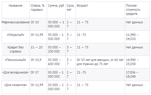 На общих условиях можно оформить кредит без справок и «Открытый». Рефинансирование – продукт для закрытия займов в других банках. «Пенсионный» и «Для вкладчиков» – программы для льготных категорий с оформлением по одному документу без справок. Кредит «Для клиентов» банка оформляется для бывших и настоящих заемщиков, получивших персональное предложение.