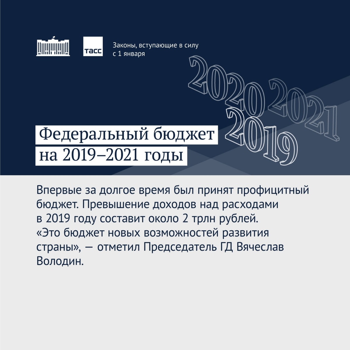 С нового года вступают в силу законы, которые активно обсуждались в обществе. Карточки от ИА ТАСС рассказывают, чем порадует нас 2019 год. Новый год принесет множество изменений в разных сферах жизни. Некоторые уже оформились в виде решений правительства и законов, другие пока только тестируются и обсуждаются. В целом можно сказать, что жизнь в России в новом году станет еще дороже, а налоговая нагрузка на нас увеличится.Но тот факт, что в стране сверстан профицитный бюджет, не может не радовать) Инфографика ТАСС