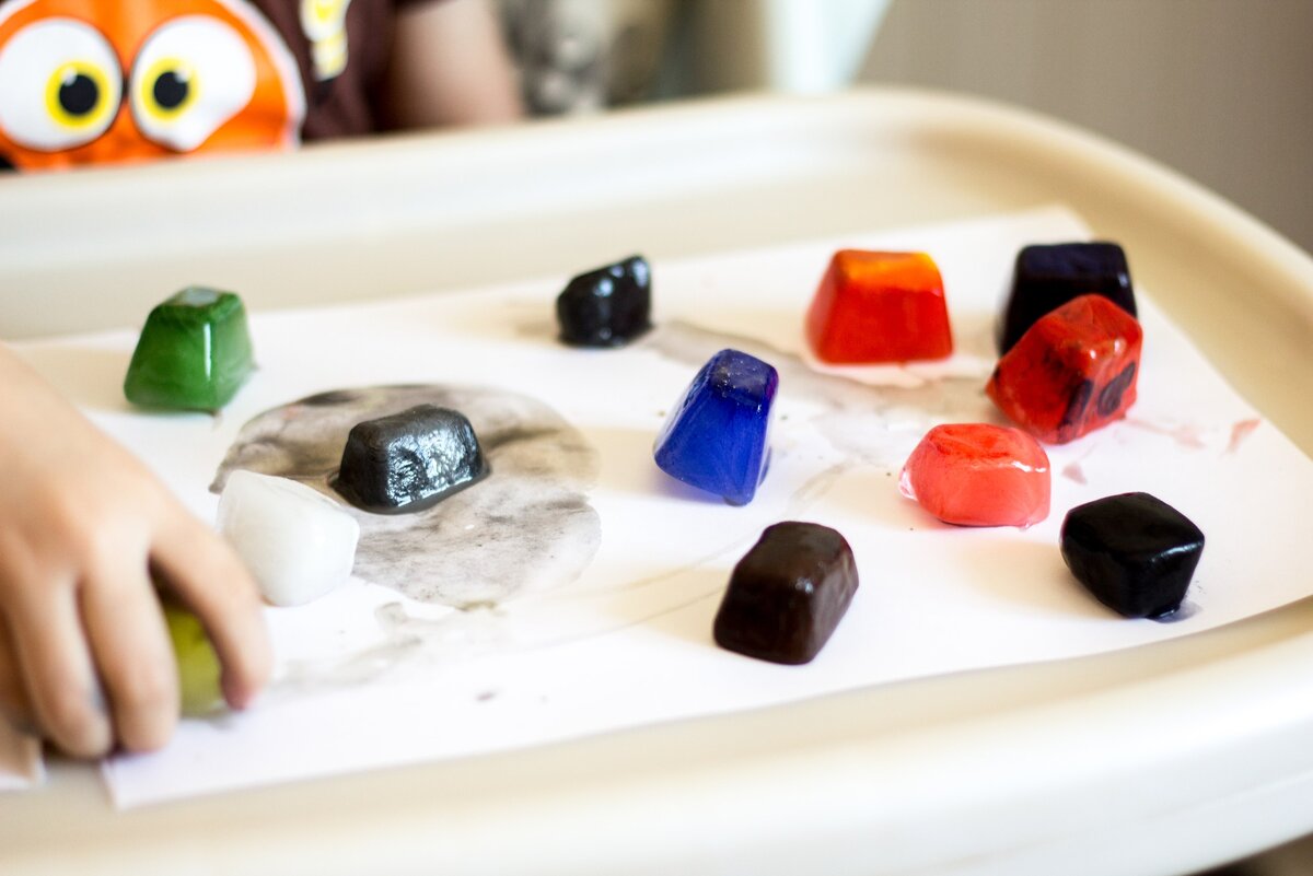 Когда Тимка был маленьким, он очень любил разные развивашки. Особенно, мы любили лепить, играть раскрашенным рисом и макаронами, красить их рисовать цветным льдом. Вот один день в картинках из наших игр: Пластилин фирмы Jovi, мягкий, не нужно разминать, удобно лепить детям, красивые яркие цвета, не марает ручки и не оставляет жирных следов. Цветной лёд. Просто берём любую форму для льда, наливаем воду и капаем краски. Насыщенность можно регулировать, количеством добавляемой краски, хотите ярче, нужно просто добавить больше. Красим крупы. На фотографиях, мы просто красили макароны в ручную.