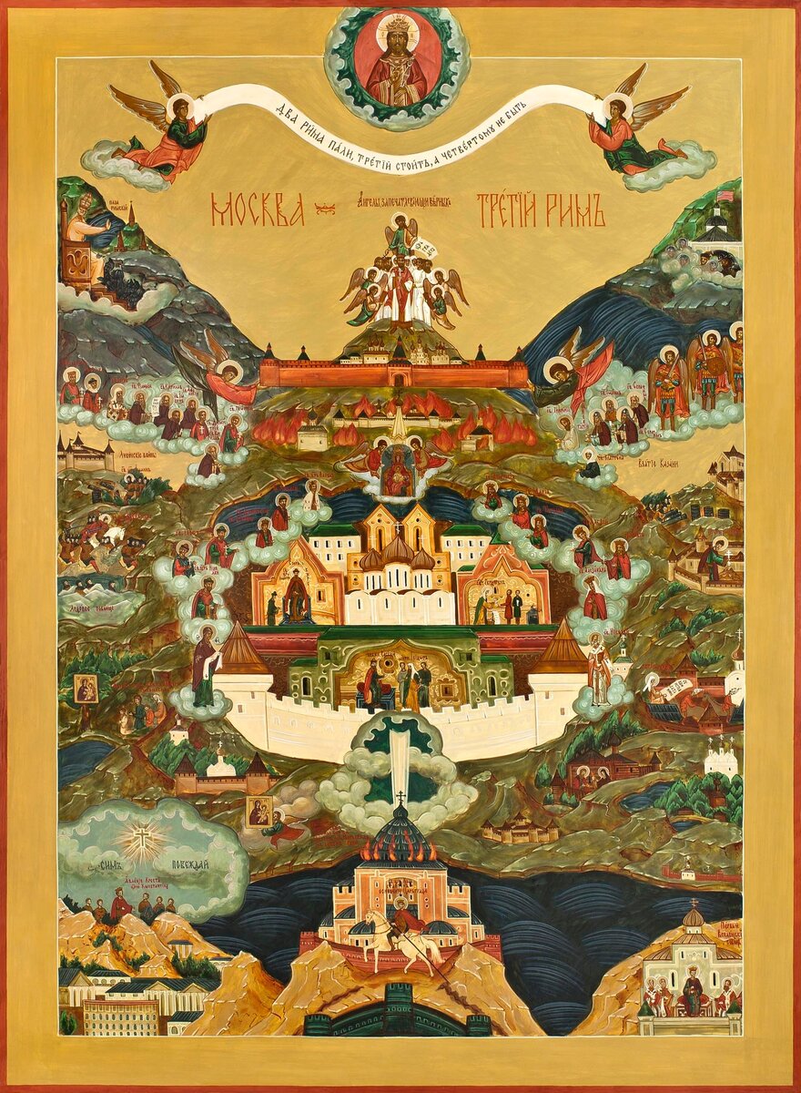 Известная всем со школьной скамьи фраза «Москва — Третий Рим» появилась на Руси в первой половине XVI века. Она была связана с философской концепцией о переносе «центра мира» в столицу Русского государства. Ее автором традиционно считается монах псковского Елеазарова монастыря Филофей. Но куда же делись первые два Рима? «Первый» Рим был центром цивилизации, носителем верховной власти на земле. После распада Западной Римской империи в результате нашествия варваров новым, «вторым», Римом стал Константинополь. Но и «второму» Риму было не суждено существовать долго: в 1453 году турки-османы захватили город, и он перестал быть средоточием христианской власти. Вновь возник вопрос — кто станет хранителем и опорой христианской веры на земле. Им, как мы знаем, стала Москва. Согласно дошедшей до нас версии послания Филофея, «первые два Рима погибли, третий не погибнет, а четвертому не бывать». Этот тезис на словах закреплял за Москвой статус последнего лидера христианского мира. Что же случится,