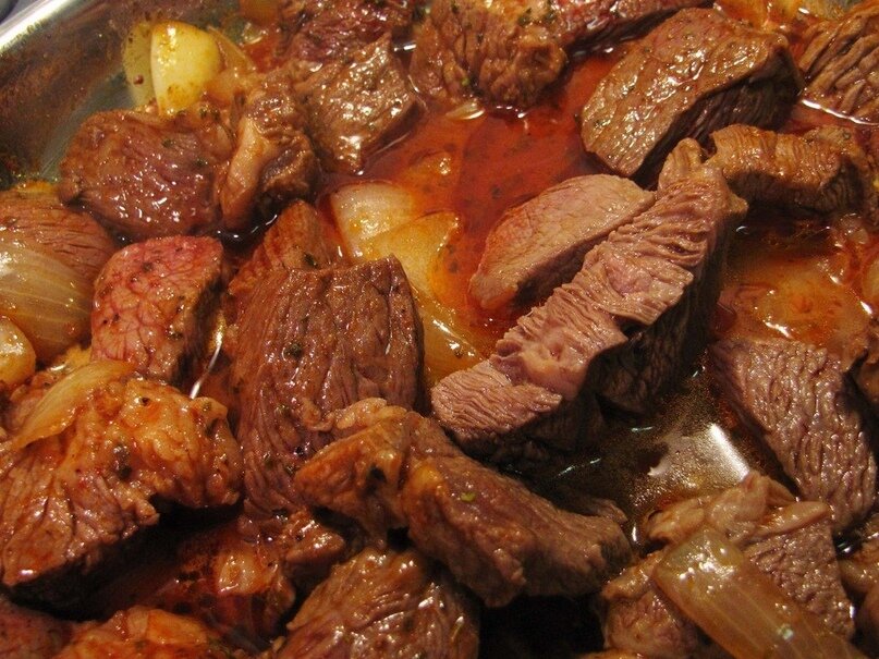 Обжарьте мясо. Добавьте лук, специи и небольшое количество воды. Перемешайте. Тушите до полуготовности.