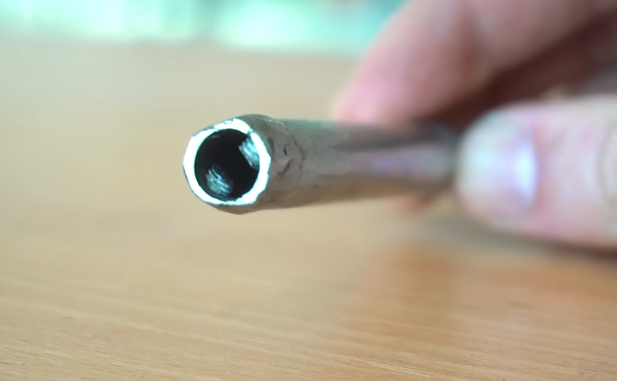 Наша самоделка почти готова. Снова помещаем сверло в трубу, убеждаемся, что оно ходит в свободной форме с небольшой помощью.