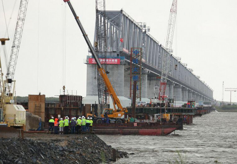 Строители железнодорожного мостового перехода «Нижнеленинское – Тунцзян» монтируют пролет между 3 и 4 опорами