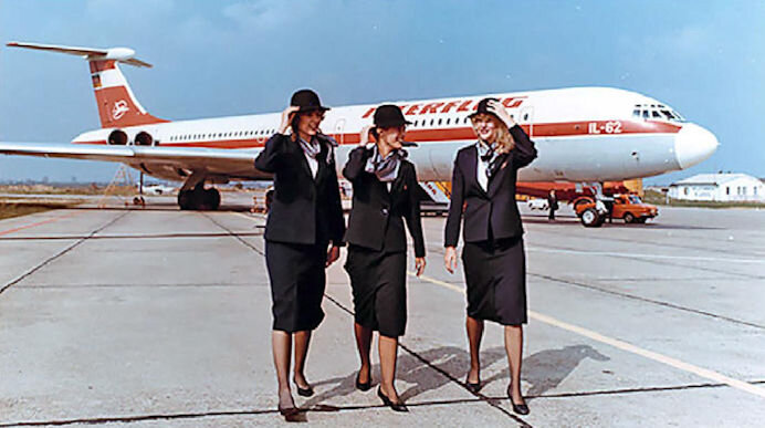 «И вот я, жена офицера ГСВГ, уже на взлетной полосе возле лайнера. Улыбчивая немочка-стюардесса ГДР в красивой летной "интерфлюговской "униформе придержала нас с сыном у трапа, пропустив вперед всех пассажиров. Мы вошли в самолет последние и она (стюардесса) разместила нас в 1-м салоне, совсем рядом с выходом, пересадив на другое место моего попутчика и освободив мне для удобства второе кресло рядом. Потом принесла нам два пледа, две подушки и какую-то упряжку, жестами показав, чтобы я закрепила в ней ребенка. Кое-как разобравшись, я надела эту упряжь на малыша и пристегнула свой ремень. Не знаю как сейчас, а тогда в наших пассажирских самолетах таких средств безопасности детям не выдавали. Взлет. Набрали высоту. Насосавшись каши из бутылочки, сын уснул в соседнем кресле. Через четверть часа стюардесса принесла на подносе разноцветные карамельки-"dropps"(чтобы уши не закладывало) и протянула мне какие-то носки из мягкой синтетической ворсовой (типа фланели) красного цвета с надпись