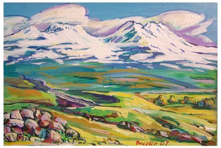 «Я работаю главным образом с маслом и акриловыми красками и применяю во внимание моих основных вдохновителей — французских импрессионистов, — начинает рассказ о своем творчестве Артур Хачатрян. — До 1996 года я рисовал в академическом стиле, потом, пережив глубокий стресс, начал писать картины в другом стиле». Интересуюсь, что же изменилось. И действительно, сравнивая картины раннего периода с более поздним, сразу в глаза бросается настроение. Картины последних лет просто наполнены солнцем, светом, добром и любовью к Армении — такой теплой и такой разноцветной: в хачаровскую Армению просто невозможно не влюбиться. Артур объясняет: «В тот переломный момент я обрел истинную свободу в своем творчестве. Я просто отдался ему. Как же это здорово стоять перед чистым полотном и знать, что ты можешь что-то создать в единственном варианте. И тогда, в 90-е, я понял, что несмотря на трудности, я никогда не покину свою страну. Не ищут лучшей доли, убегая от корней». Больше всего его вдохновляют родные горы, деревни, люди, традиции. «Я с детства приобщился к сельской местности, поэтому часто обращаюсь к деревням, огородам, цветам, - говорит художник. — Очень люблю бывать в местах, где бывал уже неоднократно, и каждый раз открывать для себя новые виды».