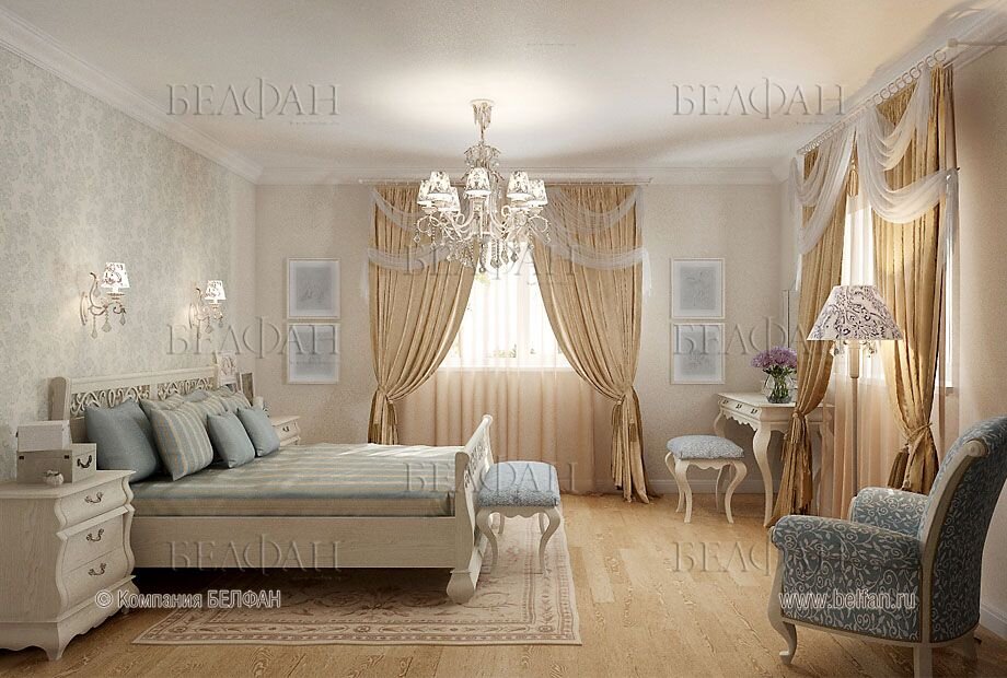 Роскошный классический стиль спальни дополнит мебель, украшенная золотым или бронзовым цветочным орнаментом. Спальный гарнитур с искусно состаренными деталями будет отлично выглядеть в стенах спальни с нежно-голубой или зеленоватой отделкой.