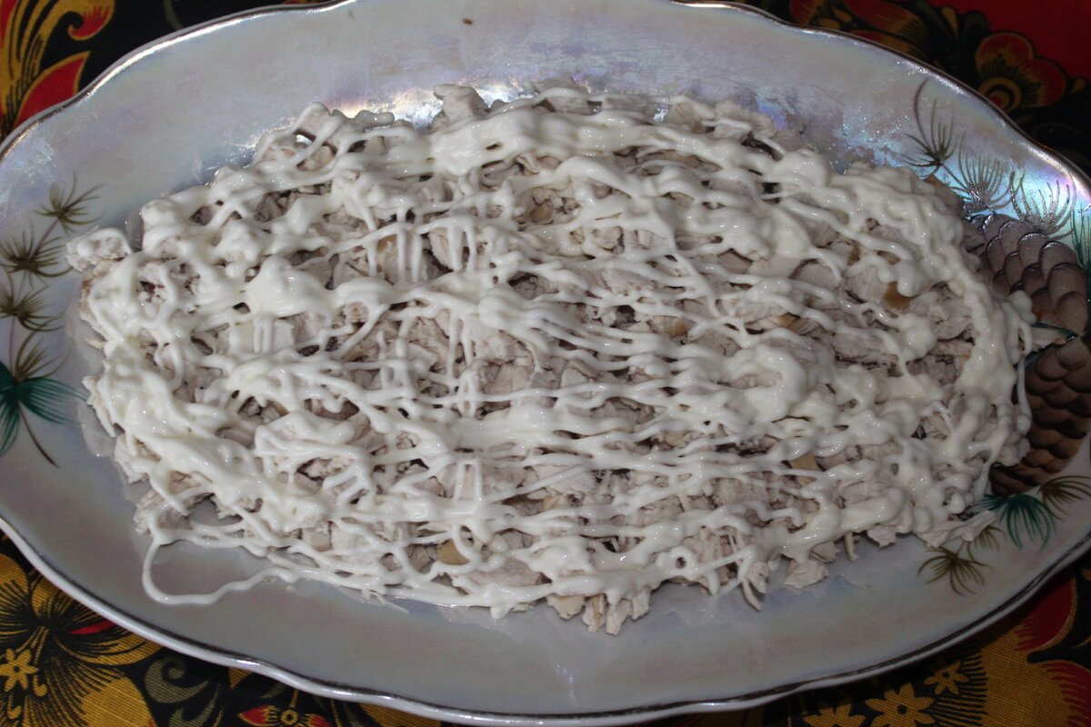 Всем доброго дня. Сегодня мы с вами приготовим очень вкусный и простой салат. Начнем с ингредиентов: 1.Грудка отварная (200 гр.). 2.Шапминьоны (50-100 гр.). 3.Сыр (100 гр.). 4.Лук репчатый (1 г.). 5.Морковь (1 шт.). 6.Маринованные огурцы (3-4 шт.). 7.Яйца (6-8 шт.). 8.Майонез. Приступим! Отварную грудку нарезаем небольшими кусочками, укладываем в салатницу и поливаем майонезом. Далее обжарим на сковороде мелко нарезанные шампиньоны и добавим следующий слой салата. После чего заранее отваренную морковь очищаем и трем на средней терке. И тоже выкладываем следующим слоем. Следующий слой из маринованных огурчиков. Нарезаем их квадратиками и укладываем на морковь. Далее трем на средней терке яичный желток и сыр. Укладываем на огурчики желток, потом обильно посыпаем сыром. И немного смажем верх майонезом. Ну и заключительный слой из яичного белка. Трем белок на терке и посыпаем наш салат. Вот и все готово. Салат получается очень вкусным и сытным. Всем спасибо за внимание и приятного аппети