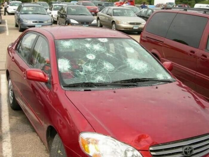 Сообщения гидрометцентра о надвигающемся граде всегда заставляли автомобилистов серьезно забеспокоиться. Этот вид осадков безобидным назвать сложно. Во время града могут серьезно пострадать люди, дома и, особенно, автомобили, оставленные под открытым небом на произвол судьбы. В числе ущерба, которые машина может получить из-за града: - различного рода вмятины на капоте, багажнике, дверях, боковых частях и крыше; - разбитые или треснувшие зеркала и стекла; - повреждение дверных косяков. К тому же, град может быть как самостоятельным видом осадков, так и частью экстремальных погодных явлений. Повреждения автомобиля после него могут довольно серьезными. Именно поэтому имеет смысл подготовиться, чтобы защитить своего верного железного коня. Первым делом стоит озаботиться покупкой специального защитного одеяла. Подобные ограждения для защиты можно как заказать в интернет магазине, так и купить в магазине автомобильных товаров. В случае, когда град застал вас в пути или во время стоянки, то
