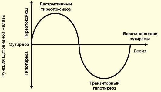 Внедрение вируса в тиреоцит вызывает разрушение последнего с попаданием фолликулярного содержимого в кровеносное русло (деструктивный тиреотоксикоз).