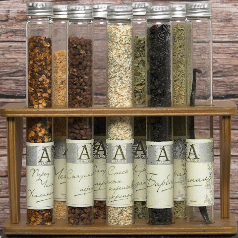 Набор элитных пряностей высшего качества "Эталон". Каждая пряность получена инновационным методом сушки. Пряности помещены в отдельные колбы, которые устанавливаются в деревянный штатив. При желании, на нем можно сделать гравировку от дарителя. Выглядит все очень стильно, а пользоваться таким набором очень удобно и практично. Когда пряность в колбе заканчивается, содержимое всегда можно пополнить. Прослужит такой набор очень долго.