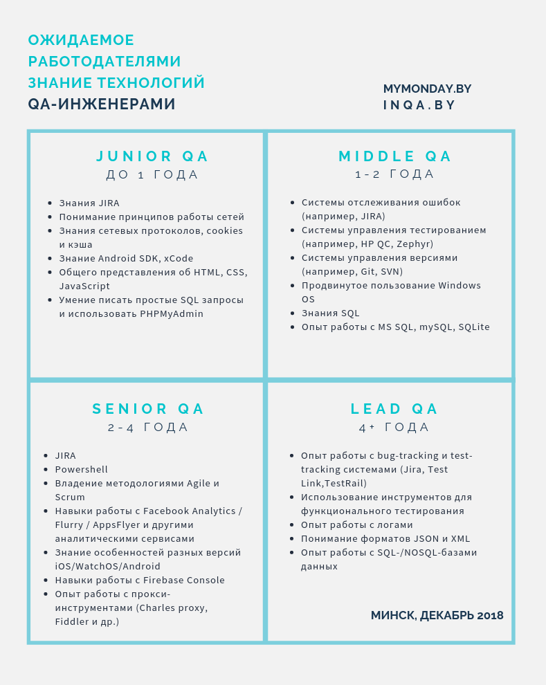 Сообщество специалистов по тестированию InQA.by совместно с образовательной студией MyMonday.by провели исследование рынка труда QA-инженеров и автоматизаторов. Задача исследования – определить наиболее распространенные требования работодателей к специалистам по ручному и автоматизированному тестированию ПО на различных профессиональных уровнях от junior до lead, ожидающие специалистов задачи и озвучиваемые работодателями зарплатные ожидания.
