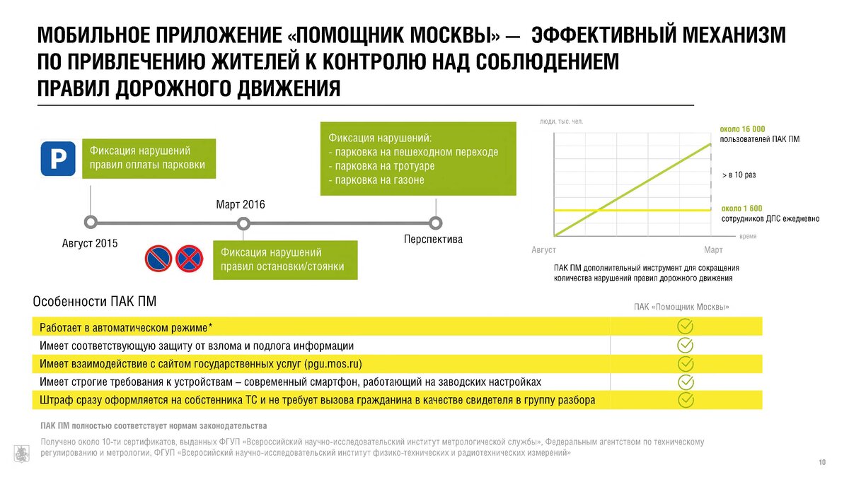 Согласно сертификату соответствия программное обеспечение программно-аппаратного комплекса «Помощник Москвы» предназначено для выявления и автоматической фиксации нарушений в области дорожного движения и благоустройства на улицах населенных пунктов посредством мобильных устройств, обязательно оборудованных/имеющих в составе средства фотосъемки и видеозаписи.