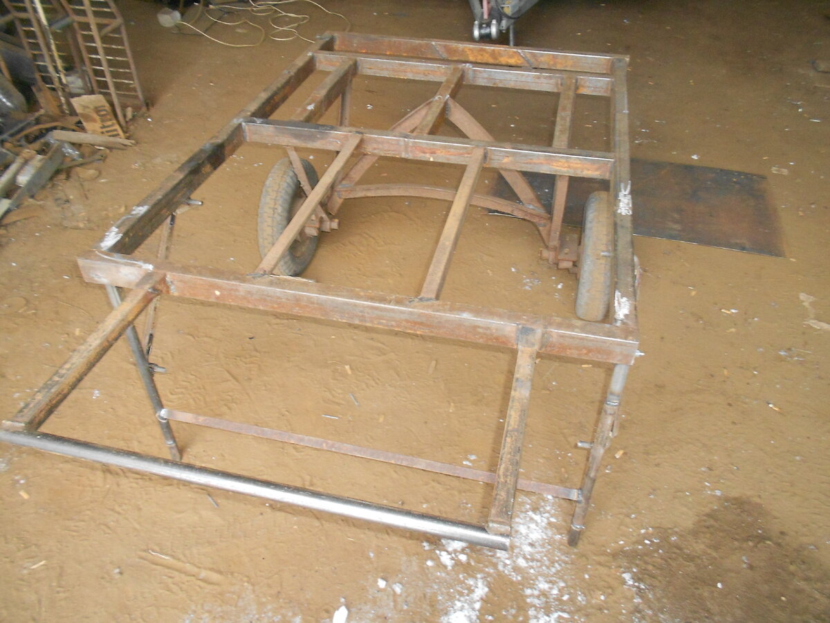 Ребята , всех приветствую . Сегодня , после долгих Новогодних праздников вышел на работу . Хватит отдыхать , пока сильно не привык ! Получил очередной заказ на переделку бортов на Мазовском прицепе , и пока был в гараже пофоткал и снял небольшое видео про свой сварочный стол . Эта самоделка совмещает в себе две функции - это телега для габаритных грузов и стол для сварки . Как так получилось? Да просто нужно было то и то . И когда начал варить телегу мне пришла мысль , что это готовый стол для сварки , просто нужно добавить откидные упоры в конструкцию телеги . Задумка была правильной и теперь эта самоделка очень помогает мне в работе . Сварил эту конструкцию из разных обрезков труб и уголков , которые остаются у меня после заказов , так что материал оказался бесплатным , колеса со ступицами от мотороллера муравей валялись у отца в сарае . Потратился только на электроды и круги для болгарки , да и то как потратился - также остаются с заказов . Откидные ножки упоры держат сьемные раск
