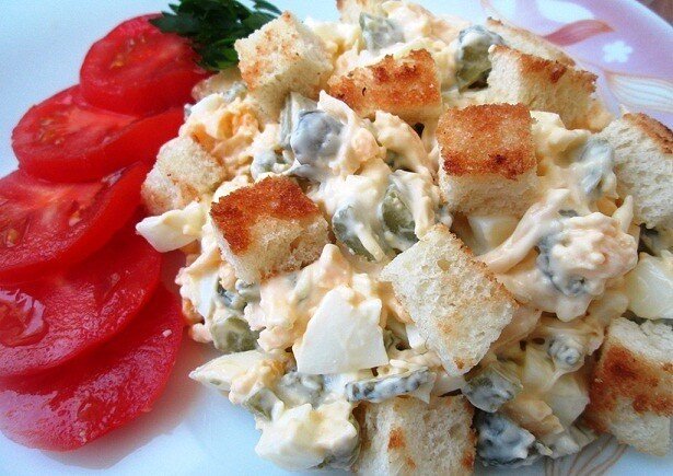 Ингредиенты: 1. Твердый сыр - 150 гр. 2. Соленый огурец - 2 шт. 3. Куриные яйца - 3 шт. 4. Сухарики ( можно покупные) - 100 гр. 5. Майонез. 6. Чеснок - 2 зубчика. Способ приготовления: 1. Сухарики для салата я готовлю сама. Для этого я беру 2 кусочка батона и разрезаю его небольшими кубками. Противень застилаю специальной бумагой для выпечки, выкладываю будущие сухари и обильно солю и посыпаю специями. Ставлю противень в разогретую духовку до 180 градусов на 4-5 минуты. 2. Куриные яйца следует отварить вкрутую, остудить и натереть на средней терке. 3. Твердый сыр так же натереть на средней терке. 4. Соленые огурцы следует порезать кубиками. 5. Зубчики чеснока необходимо пропустить через пресс или мелко порезать. 6. Все ингредиенты смешиваем между собой и только перед подачей смазать майонезом. Всем приятного аппетита!