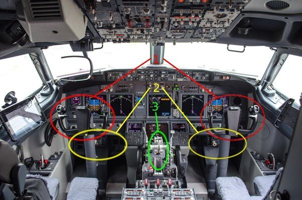 Третий важный орган управления - рычаги управления двигателями, или сокращённо РУДы. Они регулируют тягу двигателей, и, соответственно, скорость нашего полета. Можно управлять тягой вручную, но чаще всего в полете применяется автомат тяги, он управляет рычагами автоматически и поддерживает заданную скорость.