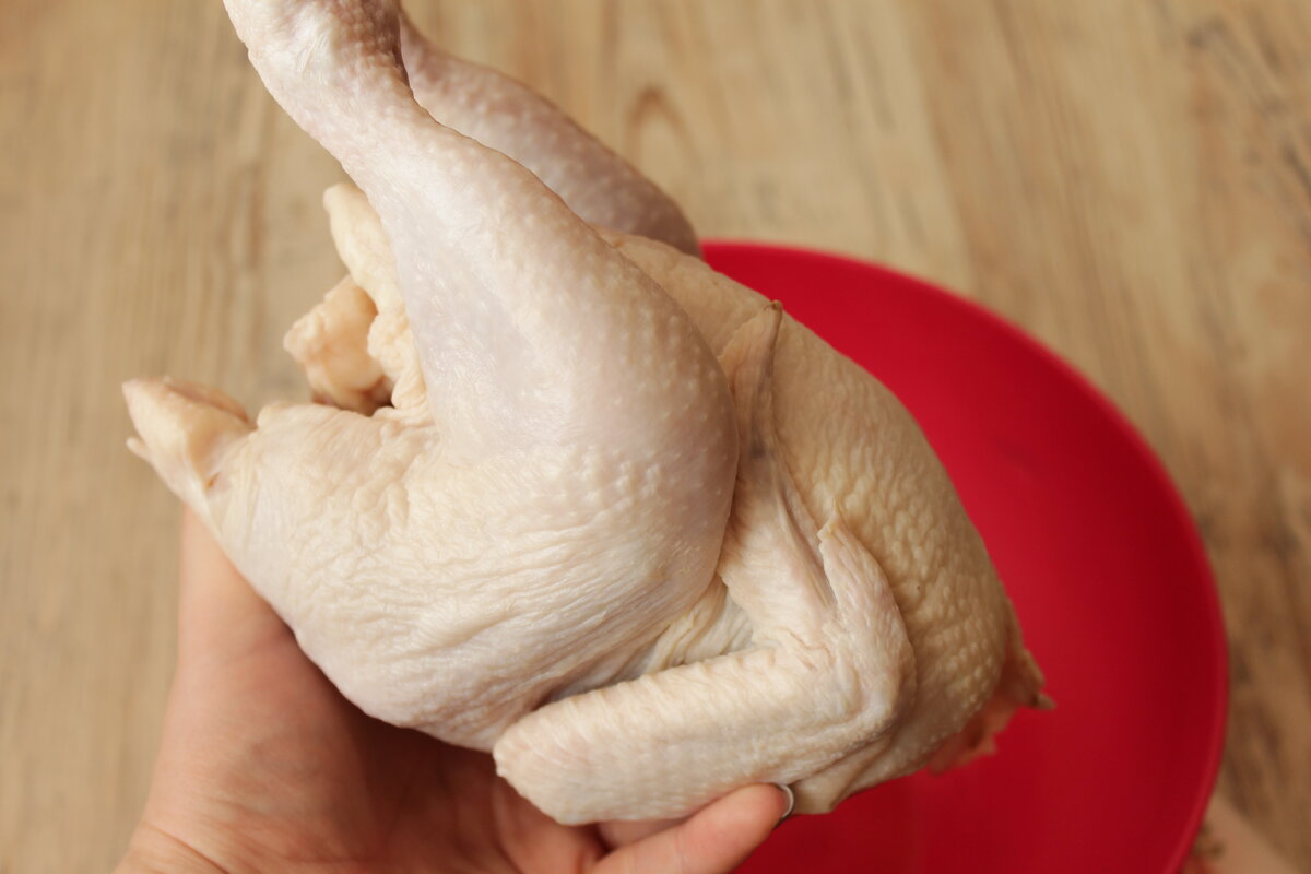 Вот такое чудо мне сегодня муж принёс из магазина... Когда я попросила его купить курицу! А потом ещё и сам прикалывался, говоря "до Магнита пешком шла...". Всего 700 г., цыплёнок... А что можно из цыпленка приготовить... Первое, что пришло мне на ум — это "Цыплёнок табака (тапака)"! Вот, его и решила приготовить... Для приготовления взяла: Курицу, ха-ха, цыпленка весом 700 г 5 зубчиков чеснока Столовую ложку топлёного сливочного масла Примерно 30-50 мл растительного масла Соль, перец, специи... Первым делом обрабатываем курицу\цыпленка. Хорошенько моем, просушиваем кухонными бумажными полотенцами или плотными салфетками, а затем разрезаем вдоль по грудке... То есть, у цыплёнка (это чудо, курицей называть как-то неудобно) крылышки и ножки будут в растопырку... Теперь разрезанного цыпленка необходимо распластать, и кухонным молоточком слегка отбить по суставам и хребту. Если у вас нет такого молоточка, сверху на цыпленка можно положить разделочную доску и несколько раз надавить рукой.