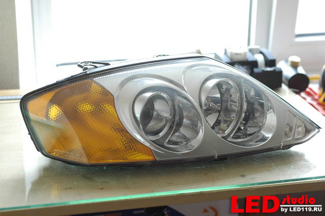 Итак, сегодня мы расскажем, как собрать и установить в фару светодиодный модуль ДХО-ПОВОРОТ на основе модуля O-BLOCK на примере фары автомобиля Hyunday Coupe. С помощью этого модельного ряда комплектующих можно сделать и задние фонари, это мы покажем в следующих публикациях. Сейчас нам потребуются комплектующие серии O-BLOCK полный список для этой работы будет в конце статьи. Так же необходим строительный термофен, паяльник 40 Вт, припой, перчатки тряпичные. Для начала необходимо разобрать фару. Снимаем фару с автомобиля и располагаем её на рабочем столе.