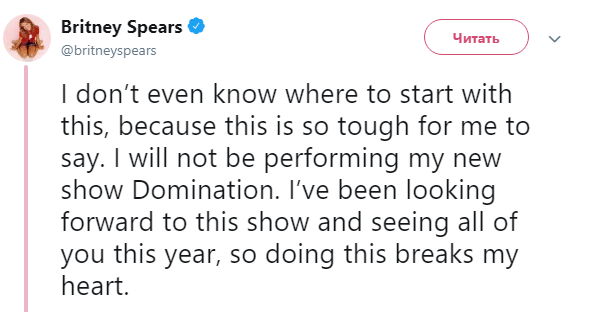 Неприятная новость для фанатов Бритни Спирс, надеющихся посетить турне поп-дивы в этом году. 4 января певица объявила в своём официальном twitter аккаунте о том, что на неопределенный срок берёт перерыв от музыки. "Даже не знаю, с чего начать, помтоу что для меня это тяжело. Я не стану выступать на моём новом шоу Dominatios. Я долго ждала это шоу, чтобы увидеть вас всех в этом году, так что это разбивает мне сердце". Причиной для такого решения послужило желание Бритни присматривать за больным отцом. Это значит, что заявленное шоу Domination, которое должно было начаться в Лас-Вегасе в феврале этого года, отложено на неопределённое время. Два месяца назад отец Бритни был госпитализирован после разрыва толстой кишки, что чуть не привело к смертельным последствиям. В настоящее время он проходит лечение в домашних условиях. Тур Britney: Domination должен был содержать 32 шоу, о чём было заявлено в октябре прошлого года. Рассчитывалось, что оно пройдёт с 13 февраля по 17 августа. также ож