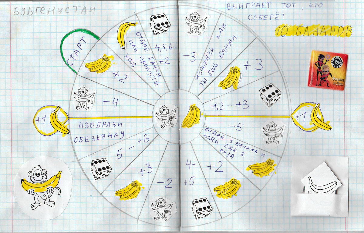 Новогодние каникулы в самом разгаре! Немало салатиков съедено, немало гостей принято и посещено!)) Наверняка уже и на ёлках, утренниках и прочих развлечениях многие побывали. Что ж... Самое время представить и новую игру для детей.)) Она придумана отцом и сыном. Опробована в узком семейном кругу и на гостях. Кстати, название игры придумал сын, и я решила его оставить и тут)) С радостью представляем вам "Бубгенустан". Что это значит нам выяснить так и не удалось. Будем считать, что это некое обезьянье царство-государство. Игра развивает образное мышление, фантазию, мелкую моторику ручек, творческий потенциал, актёрское мастерство. Позволяет весело и с пользой провести время! Вы можете изготовить эту игру самостоятельно по нашему образцу, полностью использовав все наши приёмы. Или же можете взять нашу идею за основу и придумать что-то своё собственное. Что использовали для изготовления мы: тетрадь в клетку, принтер чёрно-белый, интернет, ножницы, клей, маркеры, ручку, клей, циркуль, лине