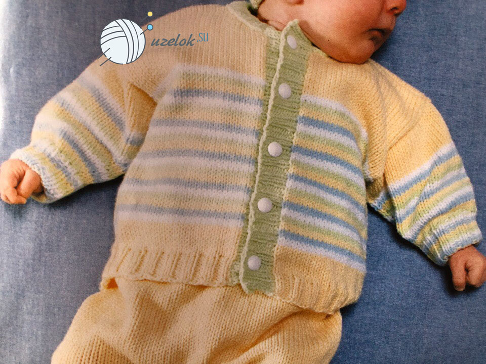 Понадобится: Рост 50 см Возраст 1-2 месяца Узоры и виды петель Рез. 2х2 (*2 лиц.п., 2 изн. п.*, повт. от * до *), лицевая гладь (1-й р.: все петли лицевыми, 2-й ряд: все петли изнаночными, повторять эти два ряда). Изнаночная гладь (1-й р.: все петли изнаночными, 2-й ряд: все петли лицевыми, повторять эти два ряда). Последовательность чередования полос: по 2 ряда нитью белого, синего, желтого, зеленого цветов. Плотность вязания 10 х 10 см = 23 п. х 34 р., соблюдая последовательность чередования полос. Выполнение работы Жакет Спинка: на спицы № 3 нитью желтого цвета набрать 66 п., провязать 2 см резинки 2 х 2 (начиная и заканчивая 1 кром. п.). Перенести все петли на спицы № 3,5, провязать лицевой гладью 2 см нитью желтого цвета, 12 см, соблюдая последовательность чередования полос, и до высоты 27 см от начала работы нитью желтого цвета. Оставить петли незакрытыми. Перед: на спицы № 3 набрать 30 петель нитью желтого цвета и далее вязать как спинку. На высоте 22 см от начала работ