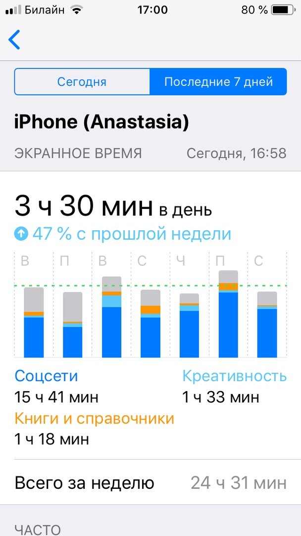 Недавно обратила свое внимание, что айфон усовершенствовал свое программное обеспечение и теперь, мы можем отследить количество времени, которое проводим за телефоном. Такая функция на устройстве называется как Экранное время, оно отображает сколько времени мы тратим на те или иные типы программы в день. На этом экране есть статистика по всем нашим устройствам. Здесь же показывается, сколько именно мы пользуемся гаджетом, а также сколько он находится в покое. Кроме того, на экране можно увидеть, на каких сайтах мы проводим больше всего свое время.