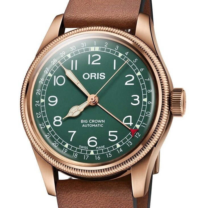 В 1938 году компания Oris представила часы предназначенные для пилотов. Та первая модель характеризовалась крупной заводной головкой, чтобы можно было пользоваться даже в перчатках, и индикацией даты при помощи центральной стрелки. Со временем эта модель стала символом бренда Орис. В честь 80-летия знаковых часов компания выпустила юбилейную версию Oris Big Crown Pointer Date 80th Anniversary Edition. Винтажная новинка сочетает в себе бронзовый корпус и нестандартный зеленый циферблат. Корпус Корпус выполнен в традиционном стиле для линейки Big Crown Pointer с рифленым ободком циферблата. Диаметр — 40 мм. Материал корпуса — бронза. Со временем бронза получит характерную патину, которая будет к лицу винтажной модели и сделает каждый экземпляр часов неповторимым. Почти все поверхности корпуса матовые, кроме рифленого безеля и задней полированной крышки. На правой стороне находится большая заводная головка — она тоже из бронзы. Задняя стальная крышка завинчивающаяся, с прозрачным минераль