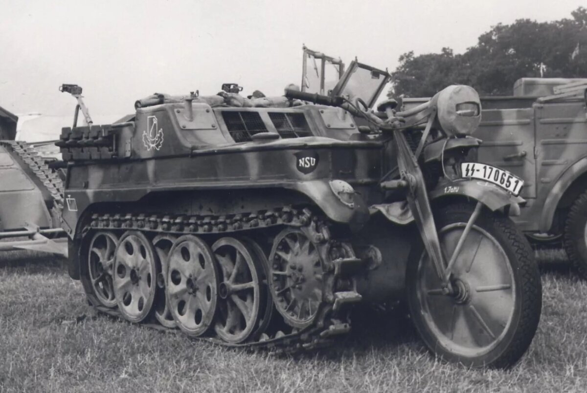 В 1940 году в Германии был собран очень интересный мотоцикл. Это был мотоцикл на полугусеничном ходу. Производителем мотоцикла была немецкая компания NSU. Он создавался для эксплуатации в парашютно десантных войсках, но благодаря своим характеристикам получил популярность во всех войсках немецкой армии. Название тягача Kettenkrad HK 101. Внешний вид его напоминал смесь трактора и мотоцикла, до этого времени никто в мире ещё не создал ничего подобного. В 1940 году прошли первые испытания и закончились они очень успешно. Тягач применялся не только для буксировки орудия, но и мог взять на буксир самолёт. На тягач установили четырехцилиндровый двигатель объемом 1.5 литра и мощностью 36 л.с. Масса тягача 1230 килограмм. Он мог перевозить до трёх человек включая водителя. Грузоподъемность 350 килограмм. Трансмиссия состоит из трёх скоростей. Размер топливного бака 42 литра, скорость движения по трассе 62 км/ч, а по бездорожью со скоростью 40 км/ч. Длина машины составляет 3 метра, ширина 1,