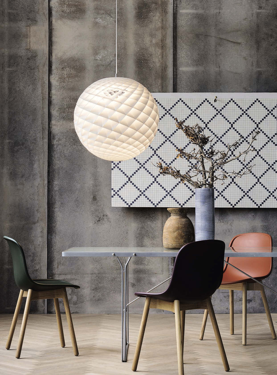Плафон потолочного светильника Patera от дизайнера Эйвинна Слаатто для Louis Poulsen состоит из пересекающихся полосок пластика, благодаря чему лампа не видна, и свет получается мягким.