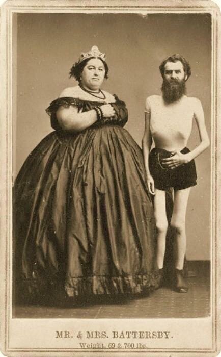 В предыдущей части мы познакомились с Фанни Миллс ("Большая нога из Огайо") и с Исааком Спрэг. Сегодня нас ждут не менее увлекательные истории. Сегодня предлагаю посвятить выпуск самым странным парам. Начать хотелось бы с Ханны Перкинс и Джона Бетерсби. Ханна Перкинс выступала как "гигантская женщина". Она весила 700 фунтов, около 320 кг. Вышла замуж за исполнителя по имени Джон Батерсби, который демонстрировал себя как "человек-спичка". Его вес - 37 кг. Ханна и Джон были очень преданы друг другу. Ханна обладала невероятной силой и могла баюкать Джона на руках, как младенца, когда он заболевал, а однажды донесла его до самого дома от горящего здания музея. В 1859 у этой пары родилась дочь Рэйчел, блондинка с греческими чертами лица и прекрасной фигурой, средних - самых оптимальных - пропорций. В июне 1889 года Ханна скончалась в своём доме. Она была похоронена в гробу шириной 7 футов. После смерти её муж, безутешный Джон, яростно оберегал дом и могилу от зевак, желавших поглядеть