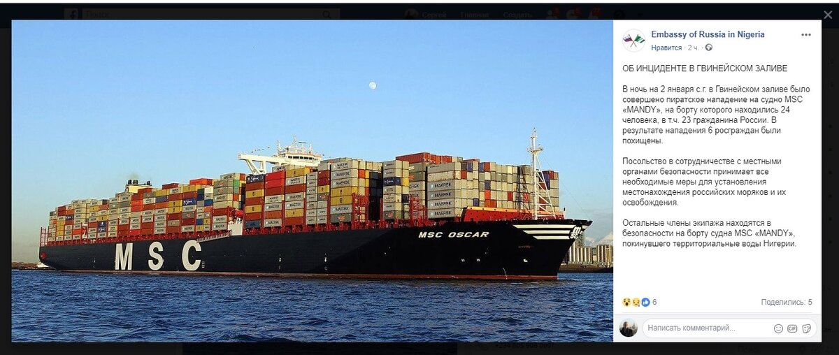 Вся эта история с похищением российских моряков в Гвинейском заливе более чем странная. Больше похоже толи на чью-то подставу, как с убийством российских журналистов в Центральной Африке. Хотя реален и другой вариант – это просто-напросто, бездарная безалаберность, капитана и всей команды и по своей нелепости и трагизму сопоставима с обрушением дома в Магнитогорске. По факту же, имеем следующее. В ночь с 1 на 2 января нового 2019 г. у берегов Западной Африки в районе Бенина и Нигерии, на расстоянии порядка 100 километров от берега контейнеровоз MSC «MANDY», принадлежащий второй в мире по величине частной компании (Средиземноморская судоходная компания (MSC) ) на борту которого находились 24 человека (из которых 23 гражданина России) был атакован и захвачен пиратами. Всего бандитов было не более девяти человек. Из них только несколько имели огнестрельное оружие (автоматы Калашникова), у остальных же были мачете. В результате захвата судна, команда была ограблена, а шестеро членов экипажа (капитан, старший помощник, третий помощник, боцман, повар и ремонтник) были взяты в заложники. Пираты находились на судне чуть более двух часов. После чего, флибустьеры с добычей и пленными благополучно спустились в лодки и отправились в свои джунгли.