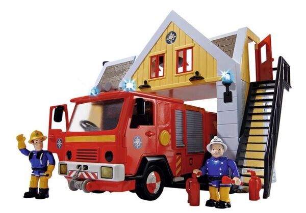 Пожарный Сэм (Fireman Sam) — британский мультсериал, созданный в 1987 году, по нему существует и целый ряд игрушек. В данной статье посмотрим, что предлагает Simba. Герои сериала постоянно попадают в забавные и опасные ситуации. Команда пожарной части, в которой работает главный герой мультсериала (пожарный Сэмюэл «Сэм» Пейтон-Джонс), всегда поможет, как бы ни было трудно. В сериале детям доступно объясняется, как вести себя в данных ситуациях, как не допустить их возникновения, поэтому полезен и сериал, и игрушки. Среди героев в мультфильме есть и собака, это далматинец по кличке Радар. А среди игрушек вы можете найти и модели на дистанционном управлении! Настоящая пожарная станция с офицером Стилом! Ворота гаража открываются, в них может проехать знакомая по мультику пожарная машина Юпитер. Внутри базы 2 этажа. Кроме гаража, здесь есть кухня, операторская и комната отдыха, которая оснащена стульями и столом. Из комнаты отдыха можно попасть в гараж с помощью пожарного