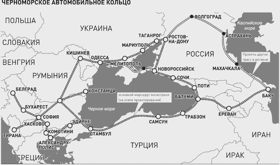 Проект "Черноморское кольцо", возникший в середине нулевых, предполагает объединить 7140 км дорог как вдоль моря, так и с выходами в крупные города. По задумке проектировщиков дорога должна быть высокоскоростной и иметь не менее двух полос в одну сторону. Кольцевая дорога должна соединить Турцию, Россию, Украину, Грузию, Молдавию, Румынию, Болгарию и Грецию. Также предполагалось подключить к проекту Армению, Азербайджан и Сербию. Стоимость проекта, по оценкам экспертов, составляет 1 млрд. долларов. Российский участок растянулся на 2230 км и охватывает такие города, как Сочи, Новороссийск, Ростов-на-Дону. Скорость по российскому участку должна составить 130 км/ч. Возможно, проект изменят и дорога пройдет через Крым, все-таки мост уже построили (но это только догадки). Не будем наивными: проект не будет реализован, если отношения с Украиной не улучшаться. Также не стоит забывать про Грузию, где пока не видно оптимизма в отношениях. Другой проект выглядит более реализуемым. Это строи