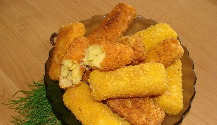 Хочется приготовить закуску к просмотру фильма? Сырные батончики - это прекрасный выбор для закуски. Именно поэтому сейчас мы научимся их готовить! Нам понадобятся такие продукты: ⦁ Молоко — 0,5 л. ⦁ Сыр твёрдый — 250 грамм. ⦁ Мука пшеничная — 175 грамм. ⦁ Сливочное масло — 75 грамм. ⦁ Яйцо куриное (3 желтка на тесто и 2 целых для панировки) — 5 штук. ⦁ Сухари панировочные. ⦁ Растительное масло. Если всё собрали, то можем начинать готовить: 1. Выкладываем масло в кастрюлю и нагреваем масло. Когда масло растопится, то высыпаем муку и перемешиваем. Не снимаем с огня и ждём, пока масса не станет похожа на замазку. После снимаем с огня и наливаем молоко. Перемешиваем до однородной массы (можно с помощью миксера). Опять переносим на огонь. Теперь мешаем и нагреваем на огне (меньше среднего). Масса должна хорошо загустеть, комков не должно быть. 2. Уносим с огня и добавляем желтки (3 штуки), и перемешиваем. 3. Теперь нам надо натереть сыр и насыпать в кастрюлю. Перемешать и добавить специи.