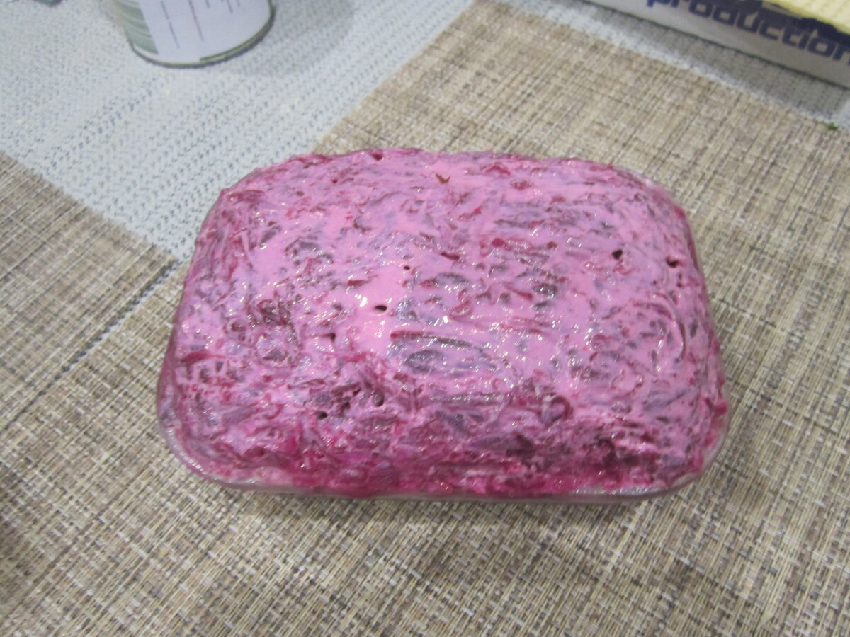Совет первый В ходе подготовки продуктов для этого излюбленного салата необходимо помнить, что его главные действующие лица - селёдка и свёкла, которых должно быть много в сравнении с другими ингредиентами! Начинаем полную раскладку продуктов. Последовательно - слой за слоем! Для полной ясности под каждой фотографией подписано количество продуктов на взятую нами прямоугольную ёмкость. 1 слой - Селёдка... Совет второй Приступая к работе с селёдкой, разделочную доску лучше спрятать в пакет, который потом сразу снять и выбросить. Запах не впитается. Селёдку для салата лучше использовать уже разделанную, чтобы не возиться. Она продаётся в пластиковых ведёрках или на развес. Такая селёдка достаточно сочная, так как находится в масле. Итак, нарезаем селёдку мелкими кусочками и плотно укладываем в ёмкость. Если селёдка не в масле, то слегка сбрызгиваем её подсолнечным маслом. Приступаем к подготовке второго слоя. 2 слой - Лук... Луковицу очищаем, нарезаем и пропускаем в блендер. Мож