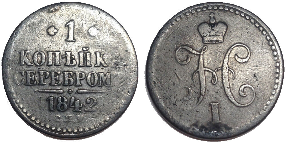 1 копейка серебром 1842 г. относится ко времени правления императора Николая Павловича — бурная эпоха в истории России. Об этом свидетельствуют острейшие социальные конфликты того времени. К ним относят движение декабристов двадцатых годов девятнадцатого столетия, Польское восстание 1830- 1831 года, Кавказская война с Шамилем, начавшаяся еще в царствование Александра Первого в 1817, проходившая с переменным успехом, в том числе и в сороковые годы, и закончившаяся только в начале последующего правления Александра Второго Освободителя в 1859 году, участие Российской империи в подавлении Европейской революции 1848-1849 годов, печальные итоги Крымской войны.
