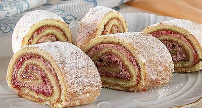 Состав : -Малина 400г -Сливки 33%-й жирности 500г -Яичные желтки 8шт -Яичные белки 4шт -Мука пшеничная 1/2 стакана -Сахар 1 стакан -Сахарная пудра 8 столовых ложек -Крахмал картофельный 1 столовая ложка Приготовление : Яичные желтки с половиной нормы сахара разотрите добела. Белки с оставшимся сахаром взбить в пышную пену и соедините с растертыми желтками. Всыпьте просеянную и смешанную с крахмалом муку. Полученное тесто выложите на выстланный пергаментной бумагой противень и выпекайте в духовке 8-10 минут. Готовый бисквитный Пласт переложите на посыпанную частью сахарной пудры бумагу, накройте салфеткой и дайте остыть. Малину переберите,промойте и обсушите.Часть ягод отложите, остальные разомните вилкой. Сливки взбейте с оставшейся сахарной пудрой в пышную пену,смешайте с мятой малиной. Смажьте бисквитный пласт взбитыми сливками и с помощью бумаги сверните его в рулет. Перед подачей рулет посыпьте сахарной пудрой,оформите ягодами. Время приготовления - 1 час. Порции - Пример