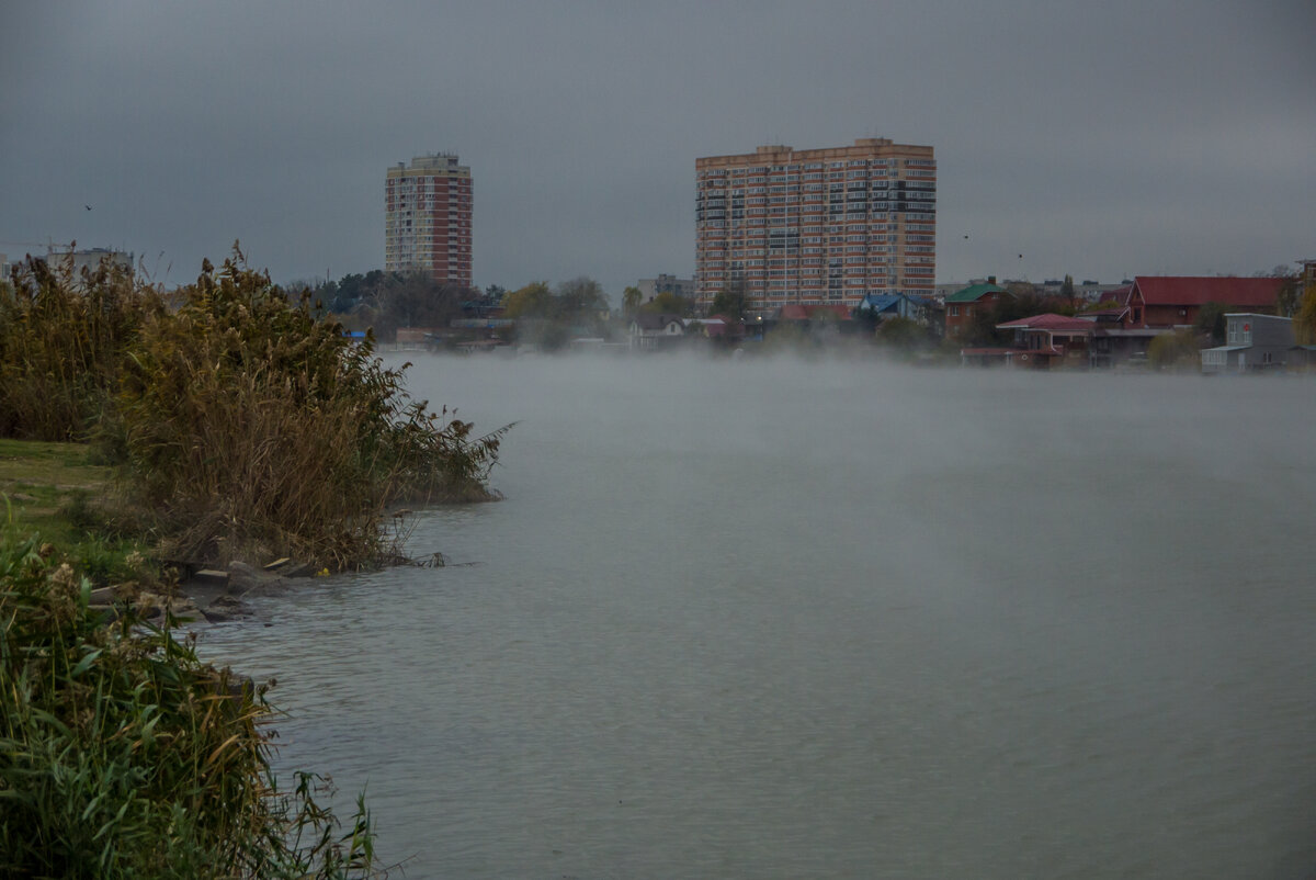 Когда мы приехали в краснодарский парк "Солнечный остров", небо над нами было полностью затянуто серыми тучами. Парк был пустой, посетителей почти не было, аттракционы тоже не работали. Но особую мистичность этой местности придавал белый густой пар, клубами исходивший с поверхности реки Кубань. Первое, что мы увидели с моста на подходе к парку - аттракцион "Дом вверх дном". И он, кстати, работал. Но мы решили не тратиться ради несколько снимков и решили лучше обойти весь остров. К тому же времени до наступления сумерек у нас оставалось не так много, а встречать ночь на почти безлюдном парке-острове нам как-то не очень хотелось. Мы прошли до конца моста и свернули налево. Теперь уже мы увидели фасад этого перевернутого дома. Ну просто нельзя не обратить внимание на эту бабочку, сидящую на земном шаре. Сзади нее - различные аттракционы. Но в день нашего приезда все они были закрыты и не работали. Мы шли дальше вдоль берега острова. Здесь река Кубань отделилась на узенькую протоку - ста