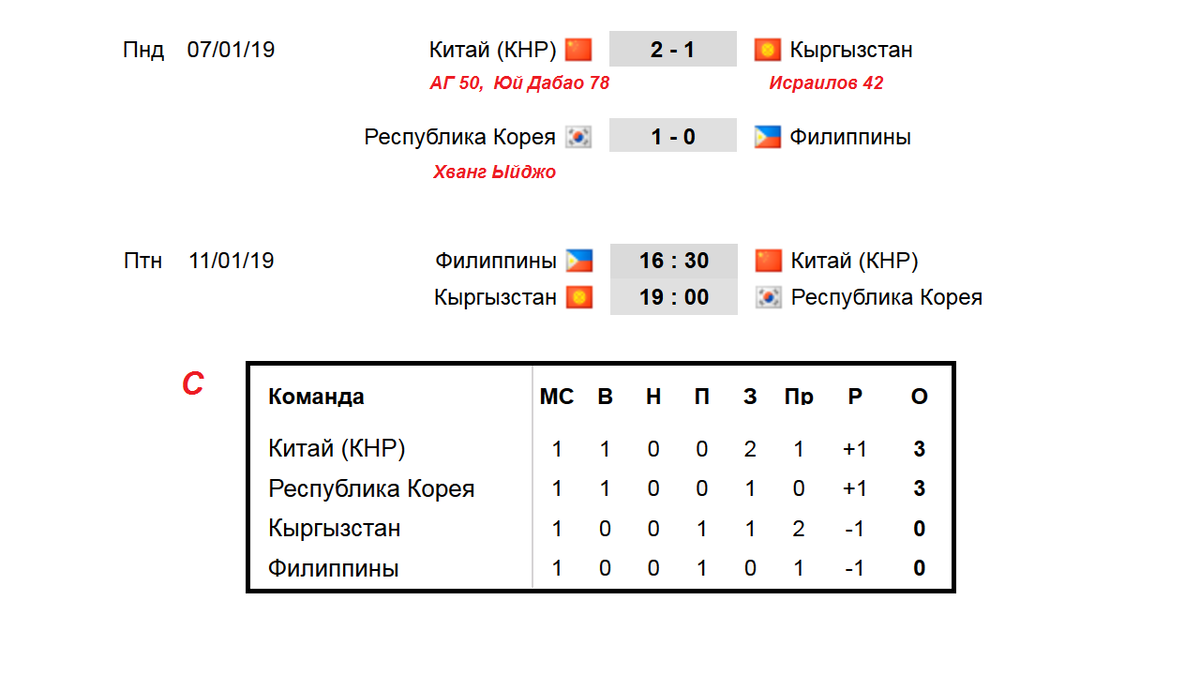 Кыргызстан проиграл Киталии на кубке Азии (2-1). География игроков очень разнообразна. Допустим Исраилов, который забил за Кыргызстан первый исторический гол на этом турнире, выступает в Индонезии. Правда, он там уже полгода не попадает в заявку и игровую практику получает только в сборной. Один из мячей за Китай забил игрок Бэйцинь Гоань – Юй Дабао, один из самых перспективных футболистов в Китае. Его одноклубником является Седрик Бакамбу. Ну Седрик Бакамбу, который прошлой зимой перебрался сюда из Вильярреала. Итак, Китай впервые побеждает с октября, а Кыргызстан проигрывает первый исторический матч на кубке Азии, сборная новичок. В этой же группе сыграли Южная Корея и Филиппины. Филиппины также впервые выступают на континентальном первенстве, и также проигрывают свой первый матч. у корейцев отличился Хванг Ыйджо, который выступает в японской лиге. Надо отметить, что Корея после победы над Германией на ЧМ, больше с той поры не проигрывает, и длится это удовольствие уже 9 игр,