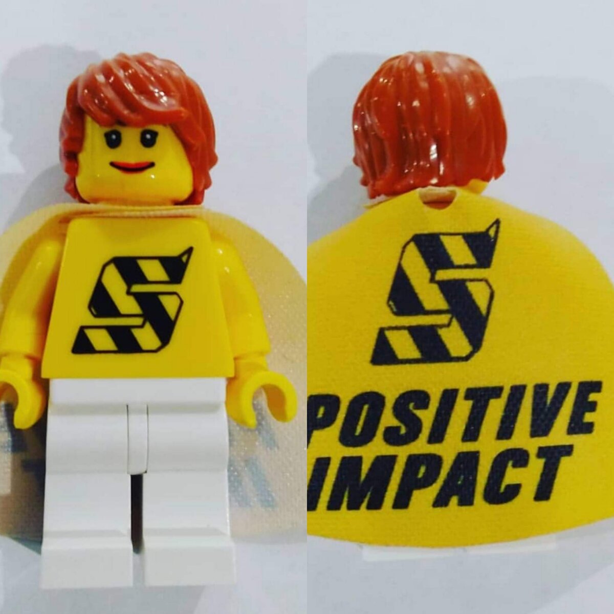 Однако эта минифигурка имеет плащ, на котором размещен тот же логотип, имитирующий букву "S", а также текст Positive Impact.