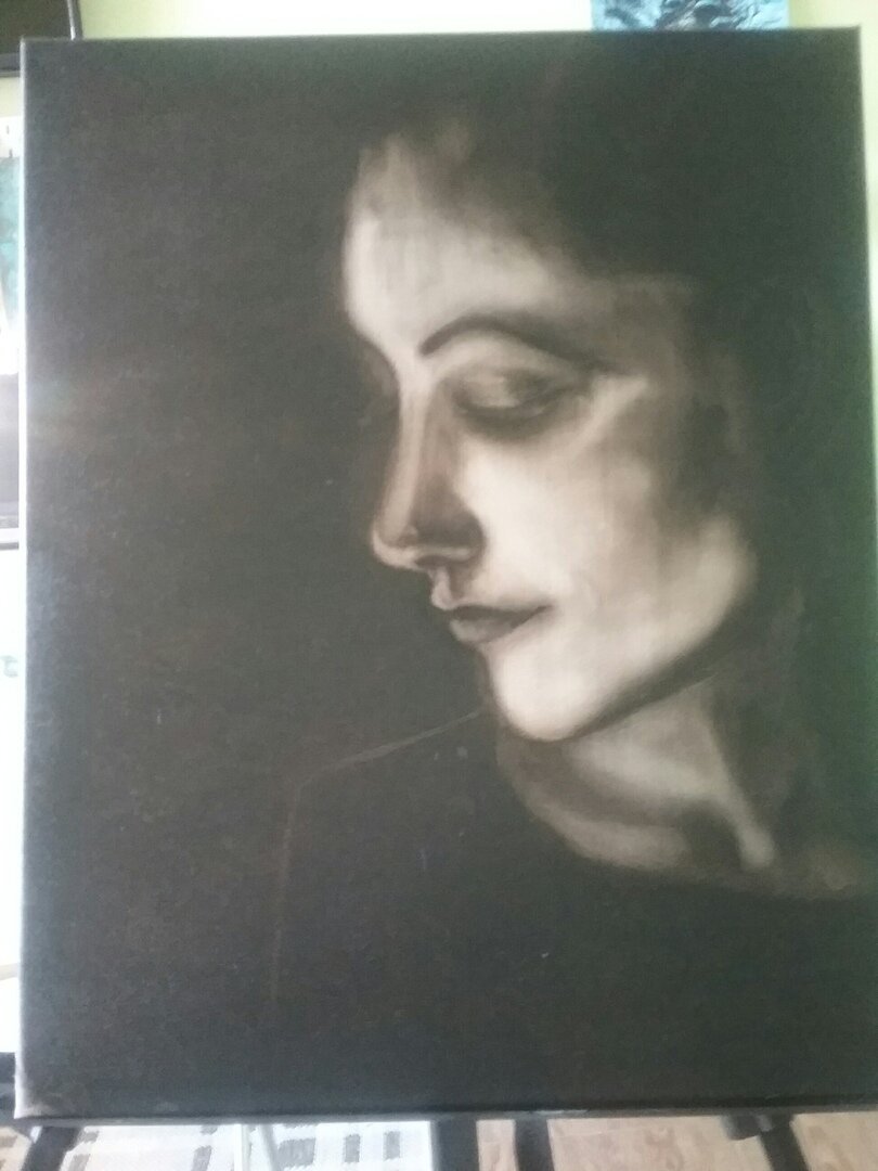 Что делать в новогодние праздники творческому человеку? Конечно же - творить! Уверена, что вы воспользовались этими свободными днями и удовлетворили своего Внутреннего Ребенка, который всегда хочет рисовать, играть, лепить, а еще гулять, бегать и прыгать. Попалось мне видео одной художницы, в котором она показывает, как пишет картины жидким маслом. И даже не использует белила. Тут же мне захотелось попробовать! Подготовила холст под эту технику: нанесла 3 слоя разбавленного водой клея ПВА. Когда холст просох - покрыла его черной и темно-коричневой краской, разбавленной льняным маслом. И, вооружившись обыкновенной тряпкой, стала вытирать краску с холста Задумка была девушки, лицо которой освещено горящей гирляндой, на которую она смотрит, держа в руке. Поэтому я высветлила и фон перед лицом девушки И начала раскрашивать. Добавила отблеска на волосах. А вот дальше что делать - не знаю. Каким цветом сделать фон перед лицом? Как поработать над гирляндой, чтобы она еще больше засветилас