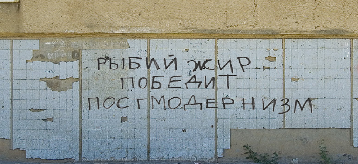 Итак, "рыбий жир". Что же это? Обходя вниманием его медицинские и питательные свойства, скажем лишь, что это чудесное вещество впихивалось в юное поколение по всему и советскому и пост-советскому пространству, что знаменует собой русское "бессмысленное и беспощадное". Пока что оставим "победит", и сразу перейдём к постмодернизму. Всем известно, что на территории России этот термин ассоциируется с сомнительным творчеством и книгами Пелевина (которые, в принципе, неплохи). Что же значит это слово, начертанное на этих скрижалях современности? На мой взгляд, оно ёмко выражает в себе всю современн