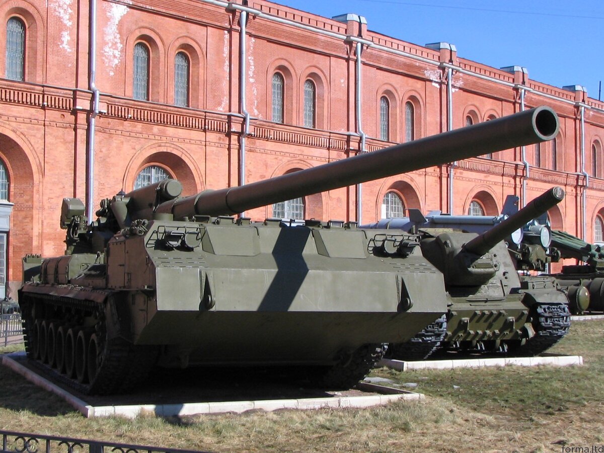 Однако при этом к артиллерии большой мощности предъявили еще одно требование - она должна была доставлять к цели ядерные заряды. В итоге вместо легких и подвижных самоходок были построены САУ, которые можно описать только эпитетами типа "циклопический" и "монструозный". Это были 406мм пушка 2А3 и 420мм миномет 2Б1.