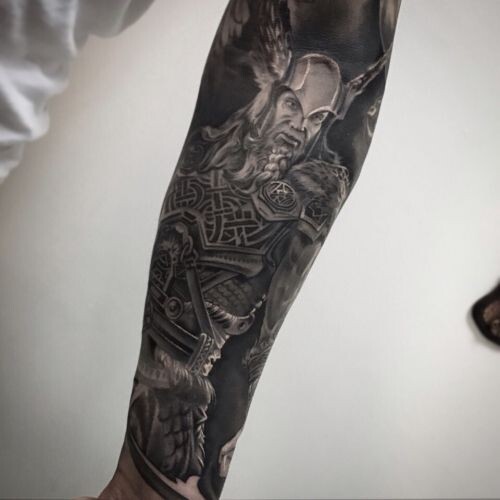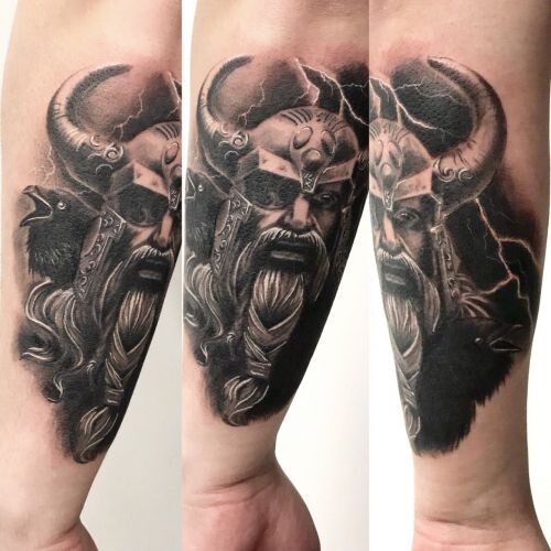 Кстати, викинга далеко не всегда изображают в рогатом шлеме, но почти всегда с оружием: ТАТУ «В СТИЛЕ» ВИКИНГОВ И ИХ ЗНАЧЕНИЯ Иногда люди просят нас сделать татуировку «в стиле викингов» — что-то связанное с их жизнью или культурой. Из таких задумок получаются целые картины: Это могут быть предметы одежды и оружие: Часто просят нарисовать скандинавские руны: свастику, Валькнут (треугольник Одина), Агисхьяльм (шлем ужаса) и чёрное солнце. Если верить, что татуировка может быть оберегом, то вот вам подсказки: Только имейте в виду, что в нашей стране эти
