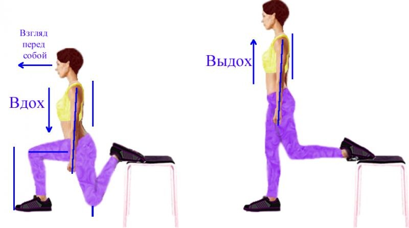 Болгарские выпады – более сложная разновидность упражнений, по сравнению с классическими выпадами. Это формирующие упражнения для мышц бедра и ягодиц. История их появления до конца не ясна. Техника выполнения Болгарские выпады относятся к упражнениям повышенной сложности. Чтобы получить результат, необходимо соблюдать правила их выполнения. Самым распространенным вариантом являются выпады с гантелями: Перед выполнением упражнения, хорошо размять коленные суставы. Исходное положение: стать спиной к скамье или стулу. Одна нога делает максимально широкий шаг вперед, другую ногу – положить на скамью. Руки с гантелями опущены, спину держать ровно, смотреть вперед. Удерживая равновесие, присесть на рабочей ноге, при этом положение бедра параллельно полу. Согнуть зафиксированное колено, опуская корпус вниз максимально глубоко. Оттолкнутся пяткой от пола, вытолкнуть таз и принять первоначальное положение. Вдох выполняется при приседании, выдох – во время вставания. Упражнение выполняется по