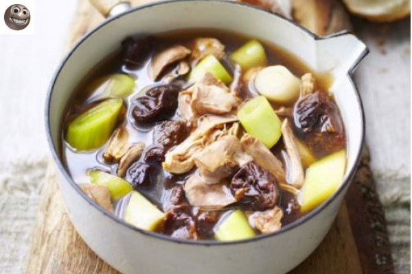 Нужно взять: 1 столовая ложка растительного масла, 1 молодой петушок, 180 г копченого бекона (сала), 2 моркови, 2 палочки сельдерея, 1-2 лук порей, 100 г белого вина, 2 лавровых листа, пол пучка тимьяна, 15-20 чернослива. Раскалите масло в казане,порубите петушка на крупные кусочки и обжарьте до золотистой корочки.Потом выньте мясо и отложите в сторону. Нарежьте морковь, сельдерей и 1 лук соломкой. Обжарьте в этом же казане 5 минут до золотистого цвета. Потом слейте жир и добавьте вино, тщательно перемешайте. Затем положите петушка, залейте водой и добавьте лавровый лист, тимьян.На медленном огне доведите до кипения и варите 40 минут до готовности петушка. Вытащите петушка и дайте остыть. Процедите бульон в кастрюлю, а остальное выкиньте, дайте остыть бульону. Когда бульон остынет снимите верхний жир. Отделите мясо от костей и порвите на кусочки. Лук порей нарежьте большими кружочками и варите с мясом и черносливом еще 30 минут. Подавайте суп с хлебом и беконом. Чернослив придает сла