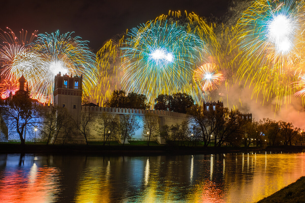 Я думал, что салют давали по всей Москве и даже думал, поехать на Поклонную гору, но как оказалось не вся столица в этом году была освещена огнями фейерверков. Нам повезло. Над Хамовниками светопредставление разошлось в полную силу.